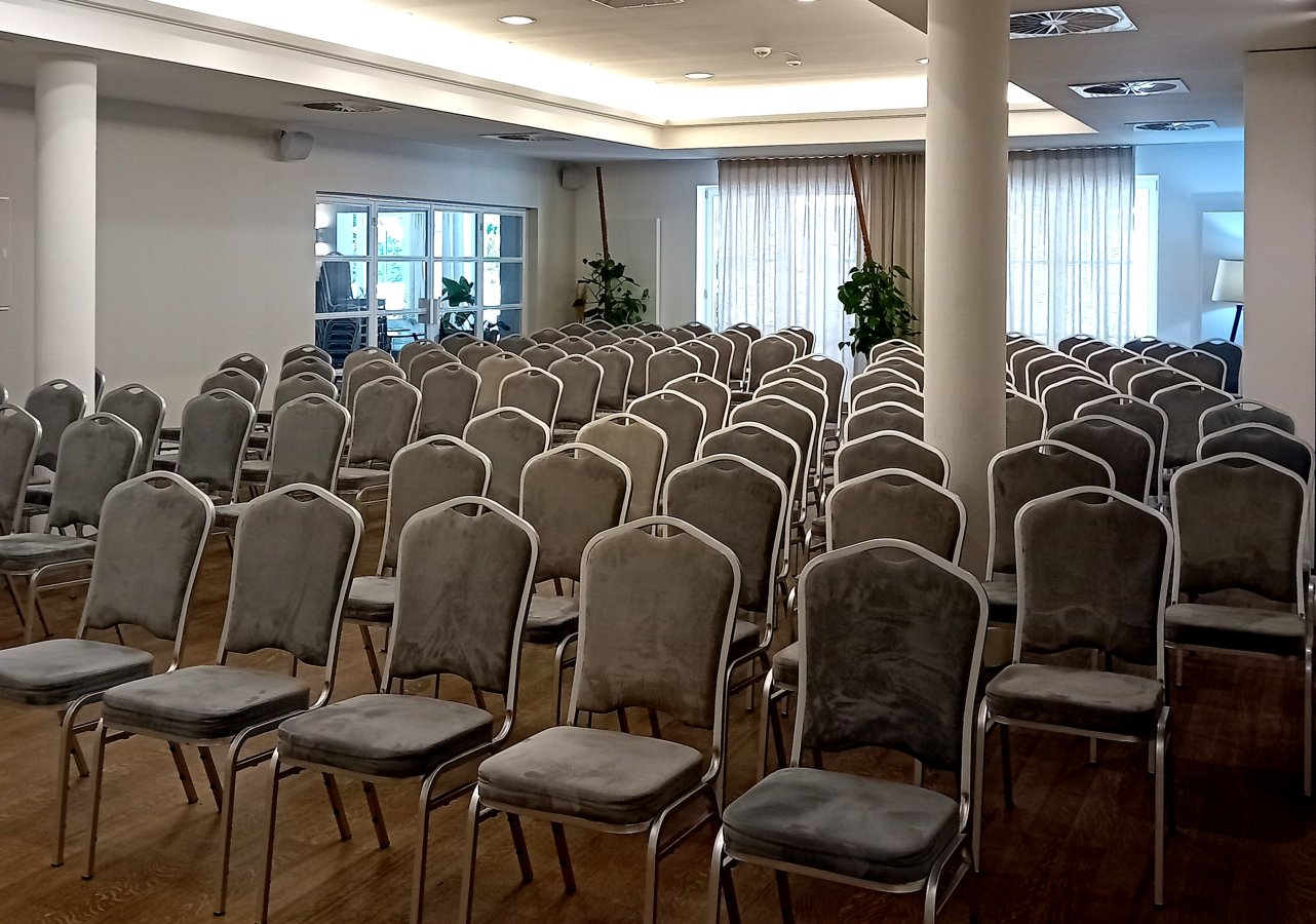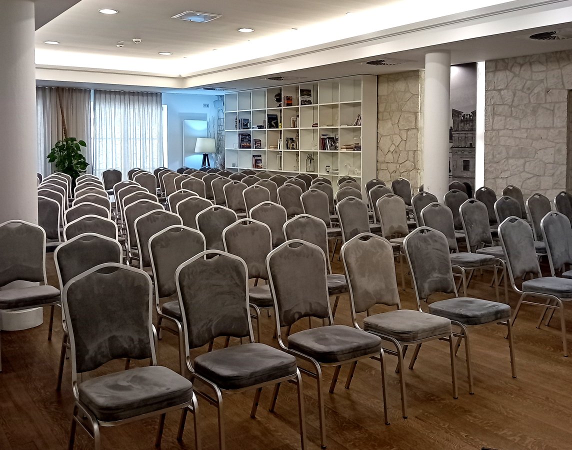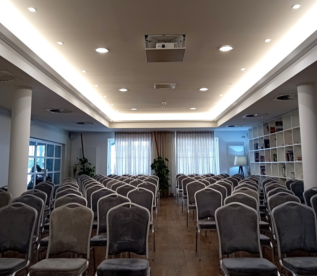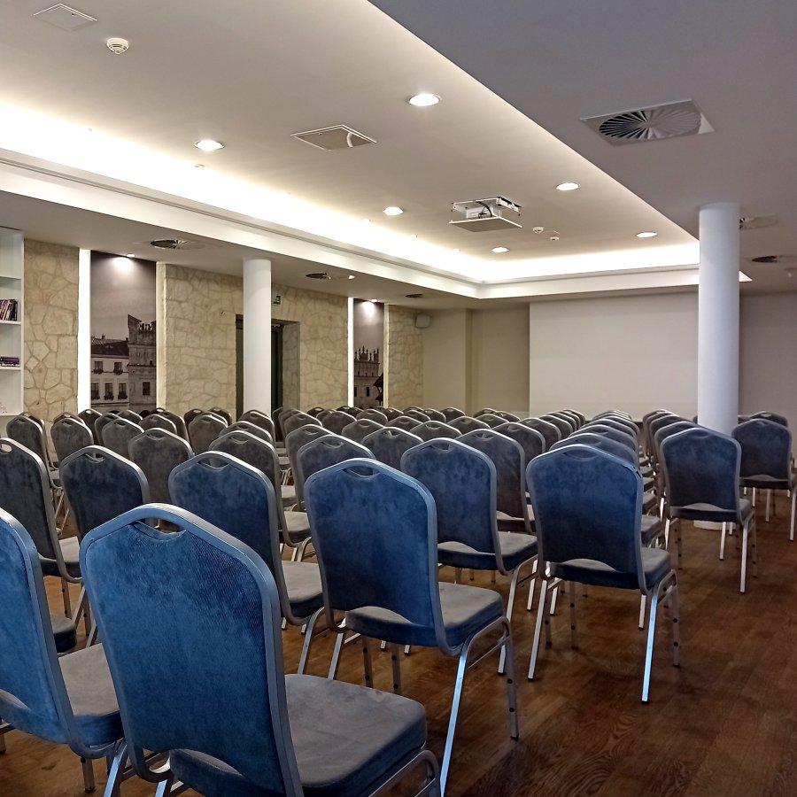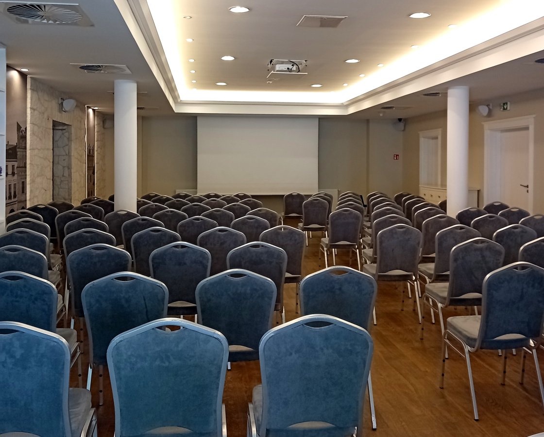 Klimatyzowana, z dostępem do światła dziennego i wyjściem na taras. W pełni wyposażona multimedialnie (ekran, rzutnik, głośniki).